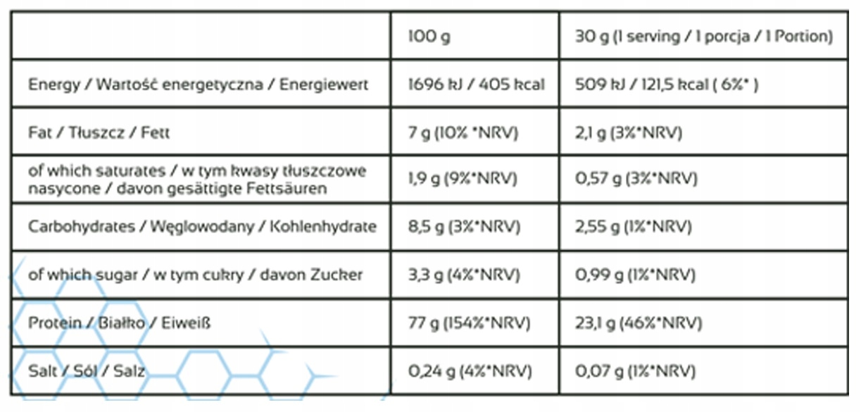 Koncentrat białka serwatkowego (z mleka), Izolat białka serwatkowego (z mleka), aromaty, substancje słodząca: sukraloza.