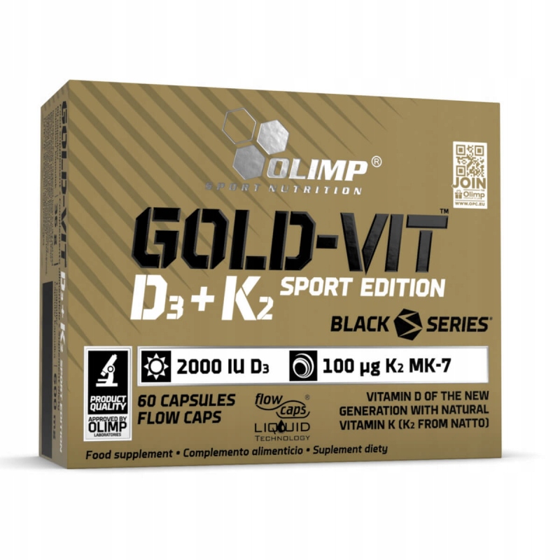 Olimp Gold-Vit D3 + K2 Sport Edition – zaawansowane połączenie witaminy D3 oraz K2 w formie doskonale przyswajalnego menachinonu-7 (MK-7) pozyskiwanego ze sfermentowanej soi. Obie witaminy stanowią niezbędny element każdej diety i ich niedobory muszą być szybko uzupełniane. Każda porcja stanowi ich bogate źródło, sprawdzi się zatem w tej roli. Witamina D pomaga w prawidłowym przyswajaniu oraz wykorzystaniu przez organizm wapnia i fosforu. Sprzyja w utrzymaniu odpowiedniej mineralizacji kości oraz zębów. Pomaga także w utrzymaniu prawidłowego poziomu wapnia we krwi. Wpływa nawet na prawidłową pracę mięśni oraz wzmocnienie układu immunologicznego. Witamina D uczestniczy w procesie podziału komórek.